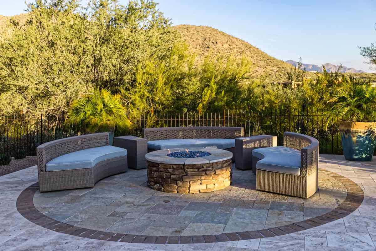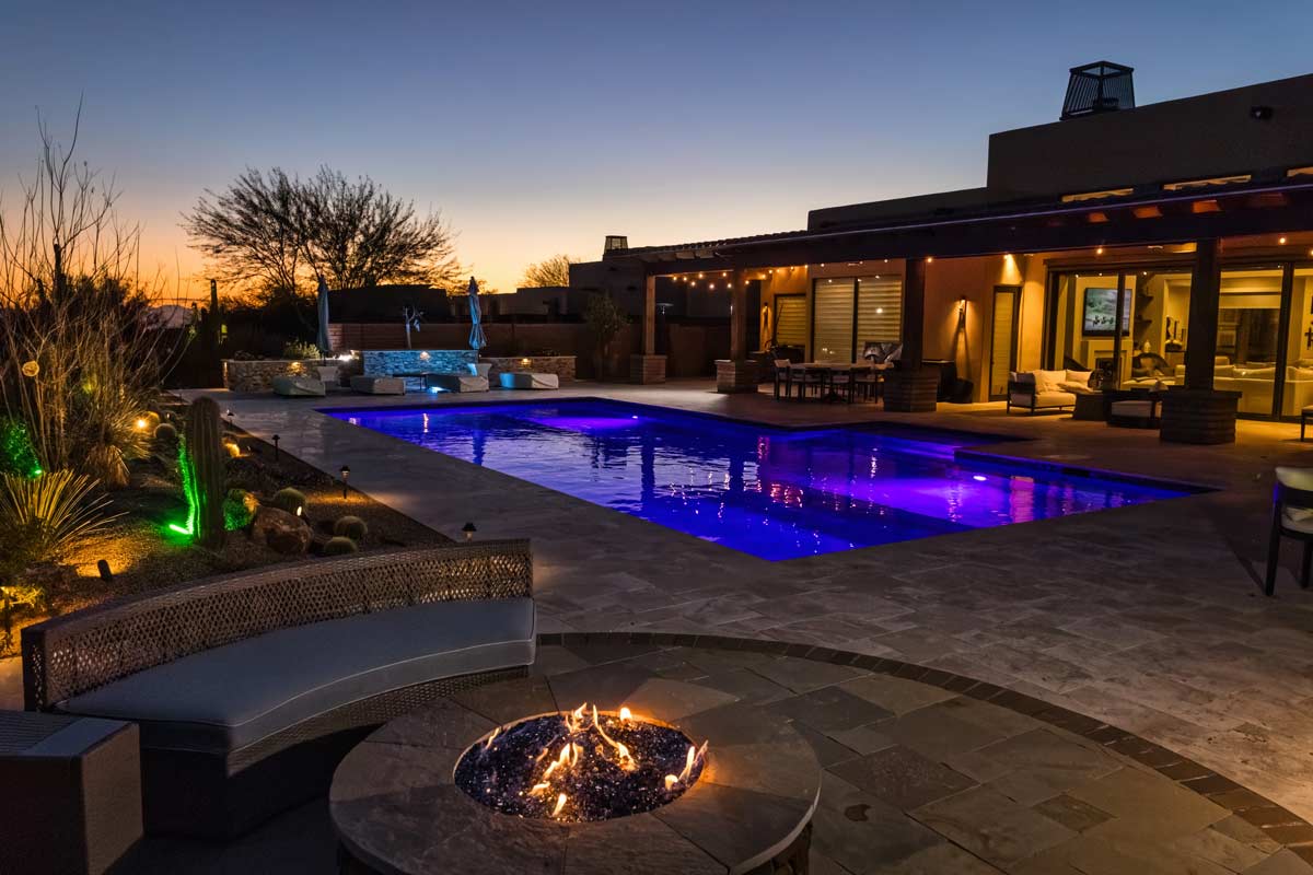 Mattamy Oro Valley Stunner in A Tight Yard With No Compromise. Complete With Precision Contouring For Easy Mobility Around The Pool, Custom Coverable Fire Pit, and Sweet Glass Tile.